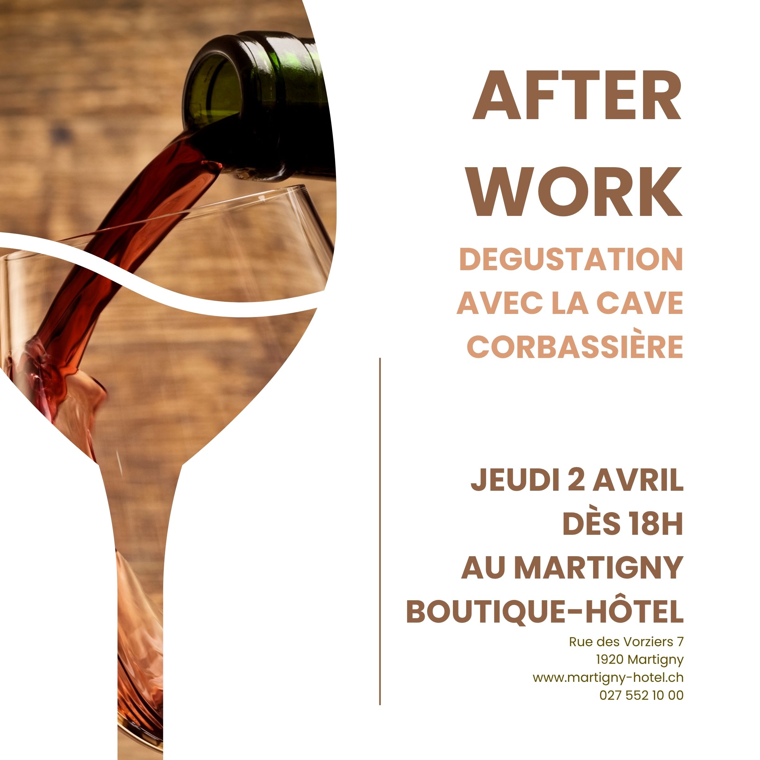 Alors retrouvez-nous à l’Afterwork du mARTigny boutique-hôtel le jeudi 2 avril 2026 dès 18h pour déguster les vins de la Cave Corbassière !